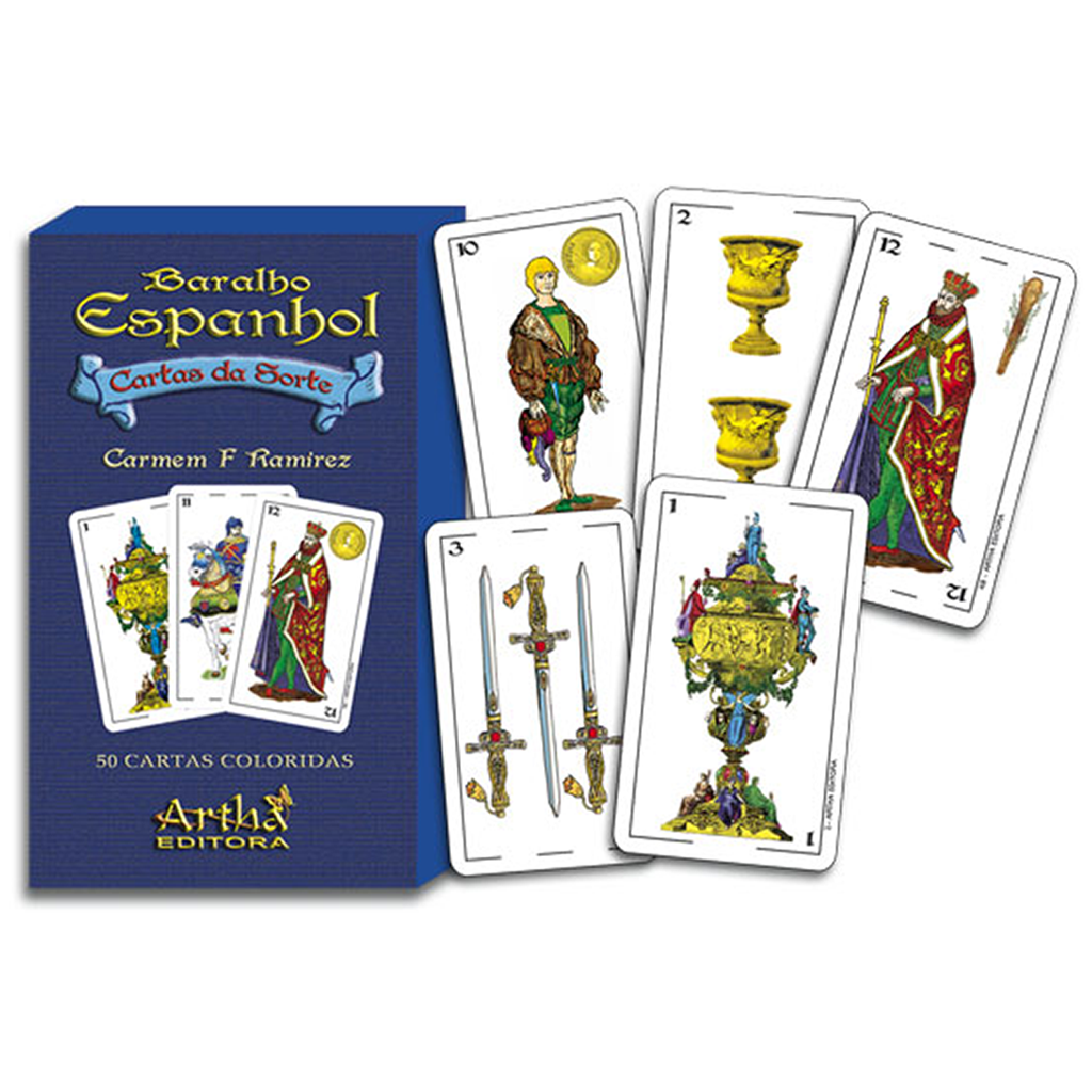 Tradicional Baralho Espanhol ou Naipe Espanhol que segundo historiadores deu origem aos Arcanos Menores do Tarô, agora com manual completo para "ler a sorte". Composto de 50 cartas, coloridas e plastificadas, com os naipes: paus, copas, ouros e espada.